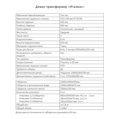 Диван-трансформер Италмас (Аквилон) продается в интернет-магазине mebel-online-kemerovo.ru по цене 73 376 руб. Есть доставка по Кемерово и Кемеровской области. Возможность подъема на этаж и сборки уточняйте у менеджера по телефону 8(800)505-27-11.