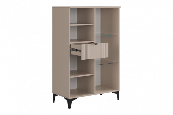Дизайн комода продуман до мелочей: с одной стороны расположена стеклянная дверца, за которой находится просторное пространство для хранения. С другой стороны – ниша с открытой полкой, выкатной ящик и ещё одна глухая дверца, что позволяет гибко организовать хранение и поддерживать порядок в доме.